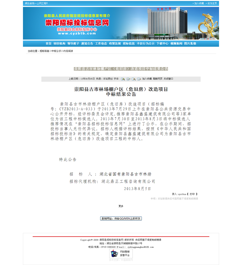 崇陽縣古市林場(chǎng)棚戶區(qū)(危舊房)改造項(xiàng)目中標(biāo)結(jié)果公告