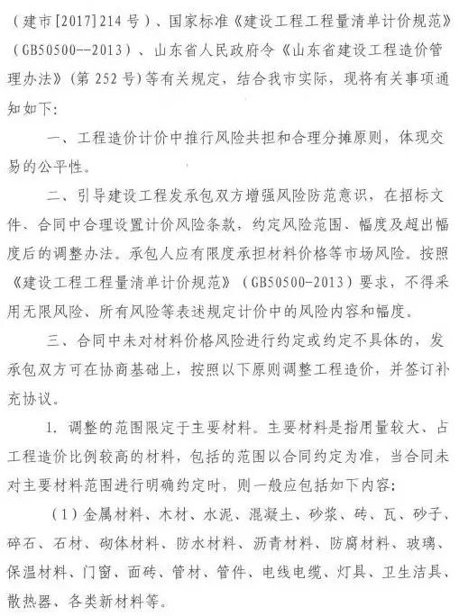 2018年1月30日,濟(jì)南市住建委印發(fā)《關(guān)于加強(qiáng)工程建設(shè)材料價(jià)格風(fēng)險(xiǎn)控制有關(guān)事項(xiàng)的通知》(濟(jì)建標(biāo)字〔2018〕2號(hào)),明確工程計(jì)價(jià)中應(yīng)推行風(fēng)險(xiǎn)共擔(dān)和合理分?jǐn)傇瓌t,承包人應(yīng)有限度承擔(dān)材料價(jià)格等市場(chǎng)風(fēng)險(xiǎn)。