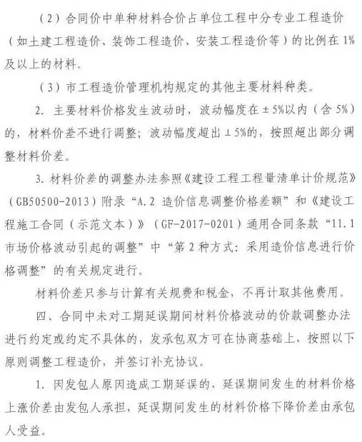 三是發(fā)承包雙方簽訂發(fā)承包合同時(shí),應(yīng)在合同中明確可調(diào)價(jià)的主要材料范圍,合理約定主要材料價(jià)格波動(dòng)的風(fēng)險(xiǎn)幅度及超出幅度后的調(diào)整辦法,公平分擔(dān)主要材料價(jià)格波動(dòng)造成的風(fēng)險(xiǎn),以保障工程的順利實(shí)施。