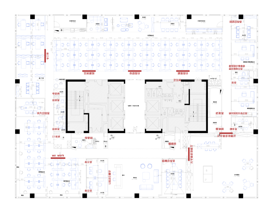 在空間規(guī)劃上,我們根據(jù)工作方式的特點(diǎn),充分考慮功能與不同情境的活動(dòng)需求,打造鼓勵(lì)與展示創(chuàng)意過(guò)程的空間氛圍。在這里,設(shè)計(jì)師們可以頭腦風(fēng)暴、集思廣益、舌戰(zhàn)群儒;亦可以舉辦各種形式的研討與社交活動(dòng);還可作為規(guī)劃設(shè)計(jì)事業(yè)部對(duì)外展示與交流的窗口。