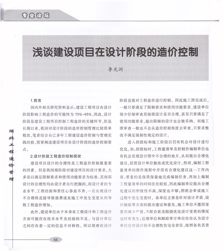 我司李光洲同志論文《淺談建設(shè)項目在設(shè)計階段的造價控制》發(fā)表