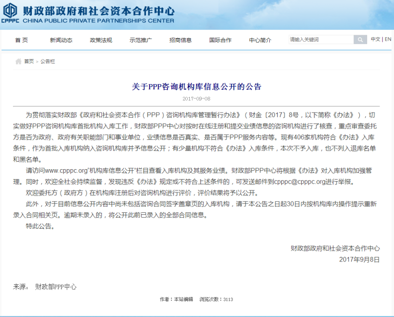 2017年9月8日,財政部PPP中心發布了《關于PPP咨詢機構庫信息公開的公告》,406家機構符合《政府和社會資本合作(PPP)咨詢機構庫管理暫行辦法》(財金【2017】8號)入庫條件