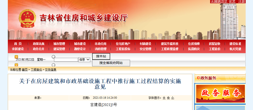 3月16日,吉林省住建廳發(fā)布《關(guān)于在房屋建筑和市政基礎(chǔ)設(shè)施工程中推行施工過程結(jié)算的實施意見》。施工合同工期一年(含一年)以上的房屋建筑和市政基礎(chǔ)設(shè)施工程,推行施工過程結(jié)算。鼓勵施工過程結(jié)算實行全過程造價咨詢服務(wù):
