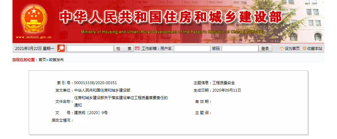 2020年9月23日,住建部官網(wǎng)發(fā)布《關(guān)于落實建設(shè)單位工程質(zhì)量首要責任的通知》,嚴格落實建設(shè)單位工程質(zhì)量首要責任。同時提出: