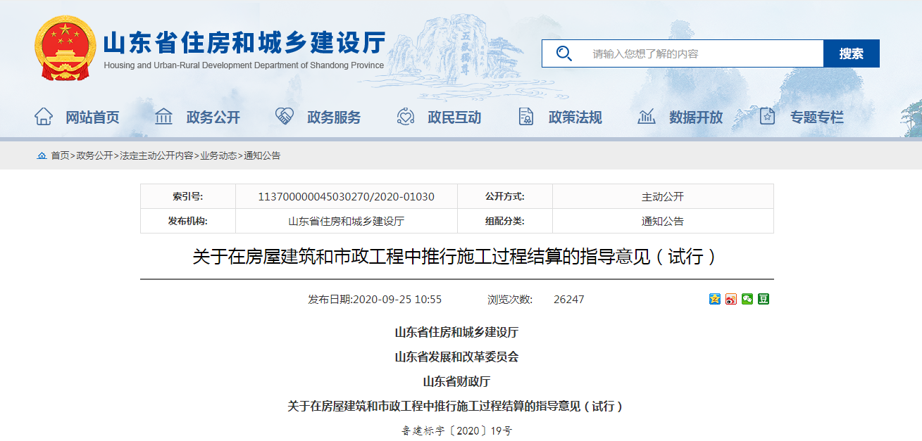 2020年9月17日,山東省住房城鄉(xiāng)建設(shè)廳、省發(fā)展改革委、省財政廳三部門聯(lián)合印發(fā)《關(guān)于在房屋建筑和市政工程中推行施工過程結(jié)算的指導(dǎo)意見(試行)》,通過規(guī)范結(jié)算行為,縮短結(jié)算周期,減輕企業(yè)負擔: