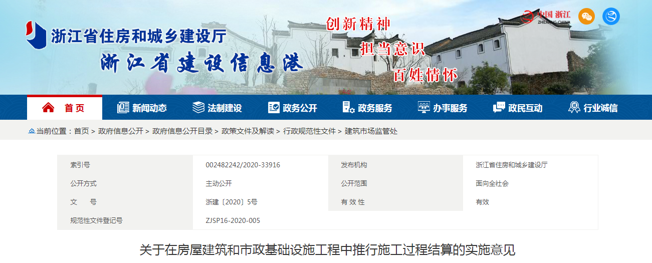 2020年5月20日,浙江省住建廳發(fā)布《關(guān)于在房屋建筑和市政基礎(chǔ)設(shè)施工程中推行施工過程結(jié)算的實施意見》:自6月20日起,在全省房建和市政項目中全面推行施工過程結(jié)算。