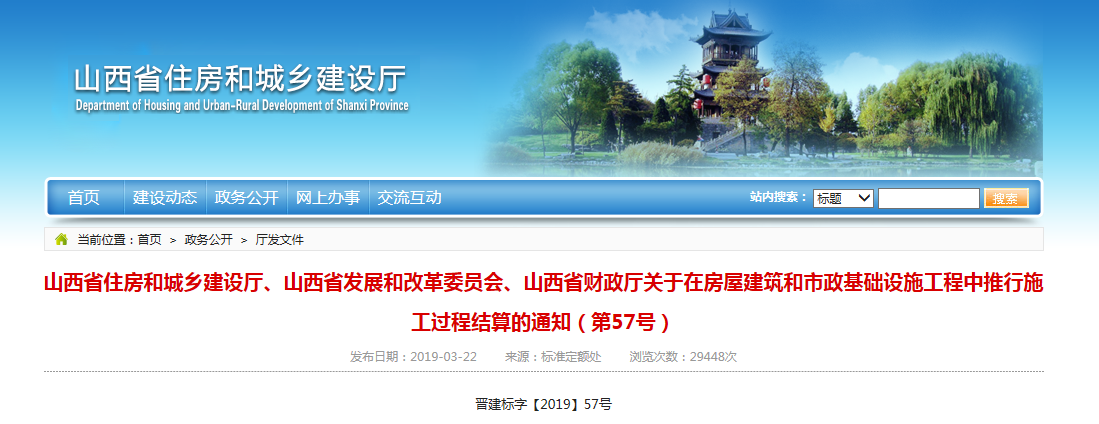 2019年3月22日,《山西省住房和城鄉(xiāng)建設(shè)廳、山西省發(fā)展和改革委員會、山西省財政廳關(guān)于在房屋建筑和市政基礎(chǔ)設(shè)施工程中推行施工過程結(jié)算的通知(第57號)》(以下簡稱《通知》)發(fā)布,從5月1日起,在房建和市政工程中推行施工過程結(jié)算: