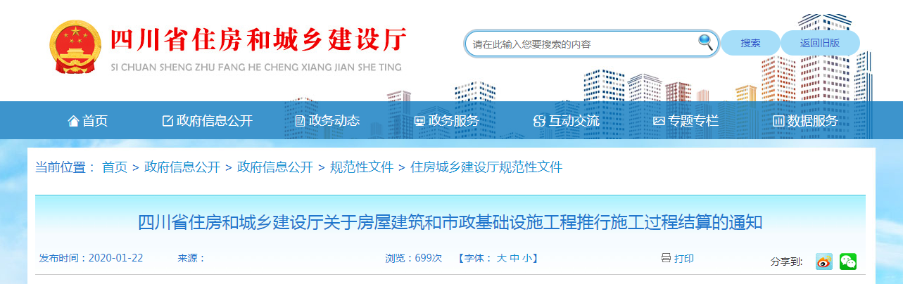 2020年1月22日,四川發(fā)文,全省房屋建筑和市政基礎(chǔ)設(shè)施工程施工合同工期兩年以上的新開工項目要積極推行施工過程結(jié)算。從2020年3月1日起執(zhí)行,有效期5年。