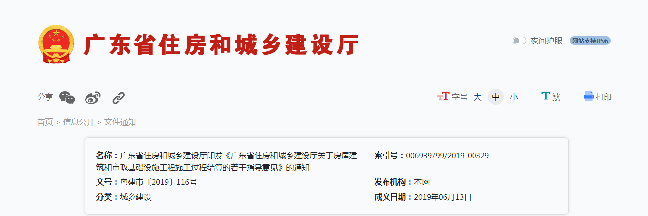 2019年6月13日,廣東省住建廳印發(fā)通知,推進全省房屋建筑和市政基礎(chǔ)設(shè)施工程施工過程結(jié)算。