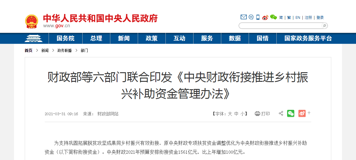第三條 銜接資金應(yīng)當(dāng)統(tǒng)籌安排使用,形成合力。綜合考慮脫貧縣規(guī)模和分布,實行分類分檔支持。對國家鄉(xiāng)村振興重點幫扶縣及新疆、西藏予以傾斜支持。東部地區(qū)應(yīng)結(jié)合實際將銜接資金主要用于吸納中西部脫貧人口跨省就業(yè)。中西部地區(qū)繼續(xù)按規(guī)定開展統(tǒng)籌整合使用財政涉農(nóng)資金試點工作的脫貧縣,資金使用按照統(tǒng)籌整合有關(guān)要求執(zhí)行。