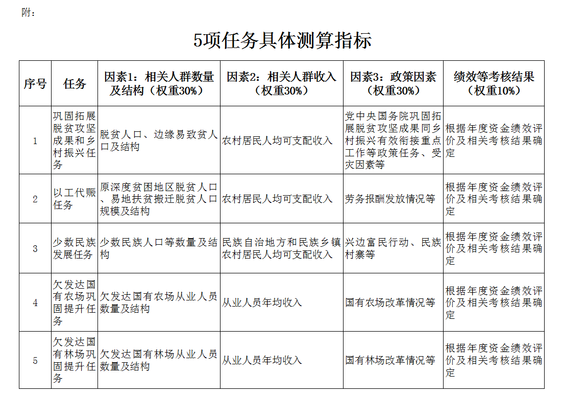 第二條 銜接資金按照鞏固拓展脫貧攻堅成果和鄉(xiāng)村振興、以工代賑、少數(shù)民族發(fā)展、欠發(fā)達國有農(nóng)場鞏固提升、欠發(fā)達國有林場鞏固提升、“三西”農(nóng)業(yè)建設(shè)任務(wù)進行分配。資金分配按照因素法進行測算,因素和權(quán)重為:相關(guān)人群數(shù)量及結(jié)構(gòu)30%、相關(guān)人群收入30%、政策因素30%、績效等考核結(jié)果10%,并進行綜合平衡。各項任務(wù)按照上述因素分別確定具體測算指標(biāo)(詳見附件)。“三西”農(nóng)業(yè)建設(shè)任務(wù)按照國務(wù)院批準(zhǔn)的規(guī)模安排。
