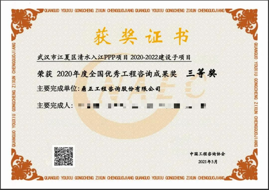 2021年3月5日,中國(guó)工程咨詢協(xié)會(huì)公布了“2020年度全國(guó)優(yōu)秀工程咨詢成果獎(jiǎng)”獲獎(jiǎng)項(xiàng)目名單,鼎正咨詢繼2019年全咨項(xiàng)目榮獲全國(guó)優(yōu)秀工程咨詢成果獎(jiǎng)后,又一PPP咨詢項(xiàng)目——由鼎正咨詢獨(dú)立編制完成的“武漢市江夏區(qū)清水入江PPP項(xiàng)目 2020-2022建設(shè)子項(xiàng)目”實(shí)施方案再度榮獲全國(guó)優(yōu)秀工程咨詢成果三等獎(jiǎng)!