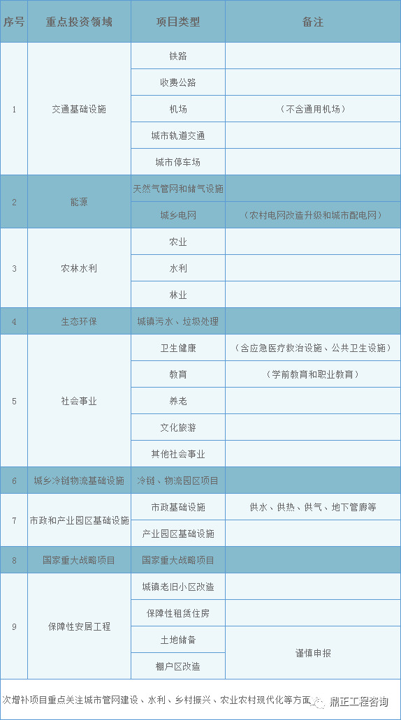 根據財政部、國家發改委的相關政策文件要求,新增專項債券資金投向領域目錄,地方政府專項債券重點投資的九大領域如下表所示: