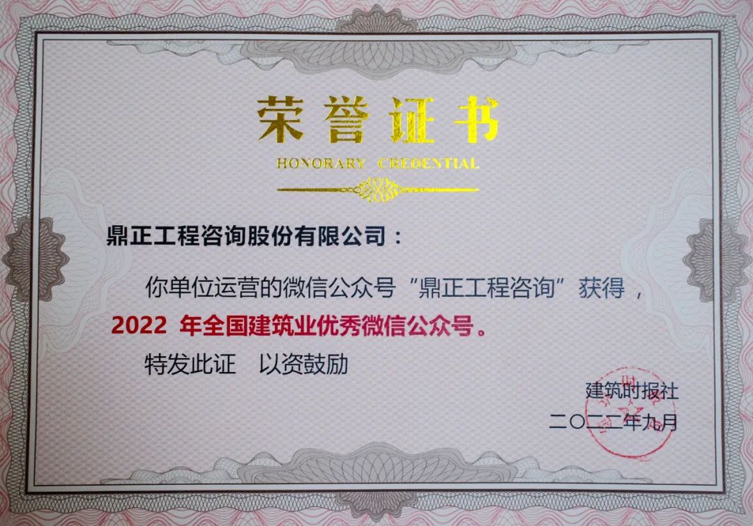9月25-26日,由建筑時報社主辦的2022建筑業微信公眾號運維經驗交流研討會暨全國建筑業優秀公眾號頒獎典禮在武漢舉辦。鼎正官方微信公眾號“鼎正工程咨詢”上榜全國建筑業優秀微信公眾號榜單,榮獲2022年全國建筑業優秀微信公眾號。