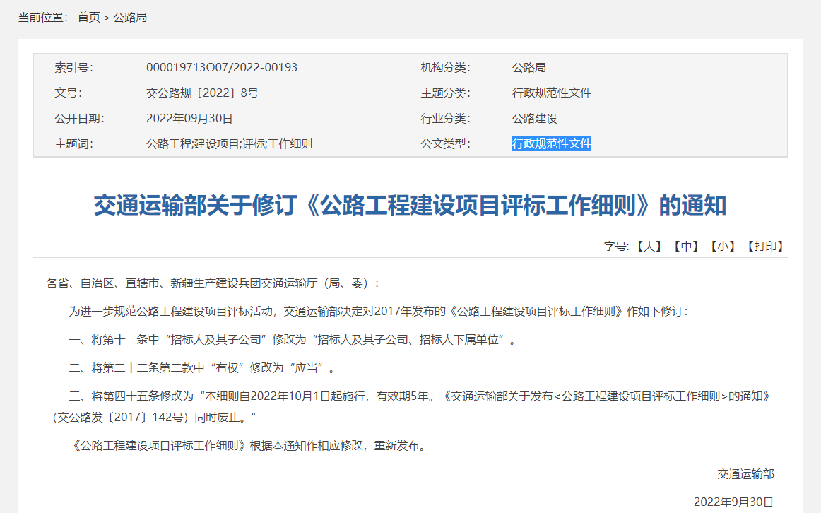 2.交通運輸部發布《公路工程建設項目評標工作細則》的通知