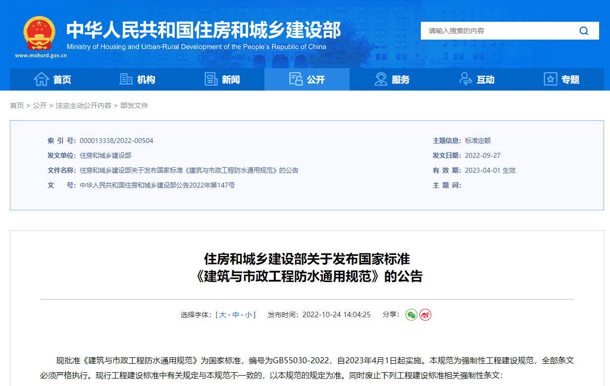 10月24日,住建部發布國家標準《建筑與市政工程防水通用規范》的公告。現批準《建筑與市政工程防水通用規范》為國家標準,編號為GB55030-2022,自2023年4月1日起實施。本規范為強制性工程建設規范,全部條文必須嚴格執行。現行工程建設標準中有關規定與本規范不一致的,以本規范的規定為準。