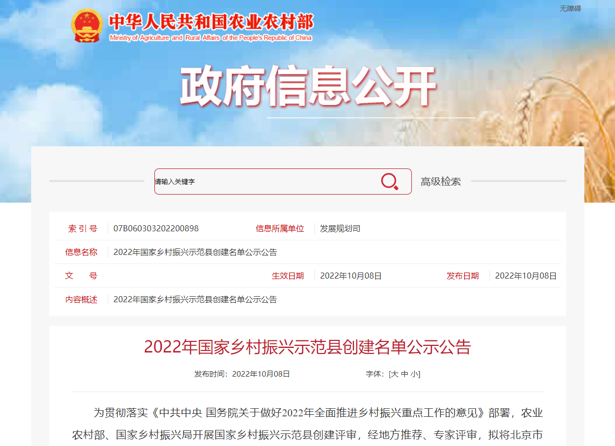 農業農村部、國家鄉村振興局開展國家鄉村振興示范縣創建評審,經地方推薦、專家評審,擬將北京市大興區等100個申報單位納入2022年國家鄉村振興示范縣創建名單,湖北省4地入圍。