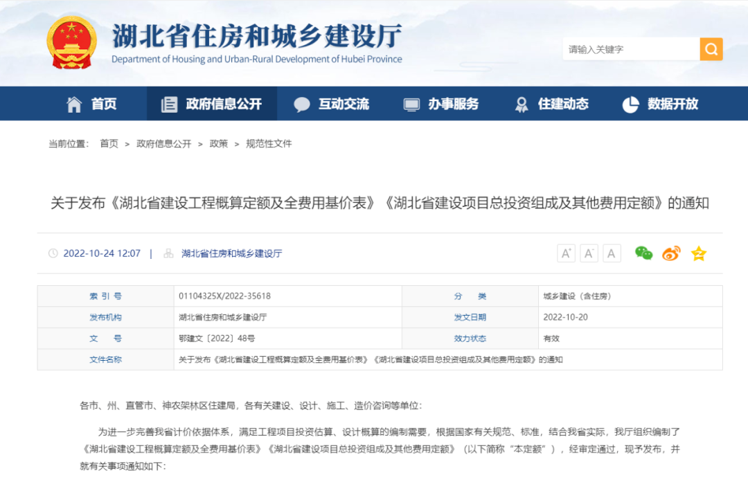 2.湖北省住建廳發布《湖北省建設工程概算定額及全費用基價表》《湖北省建設項目總投資組成及其他費用定額》的通知