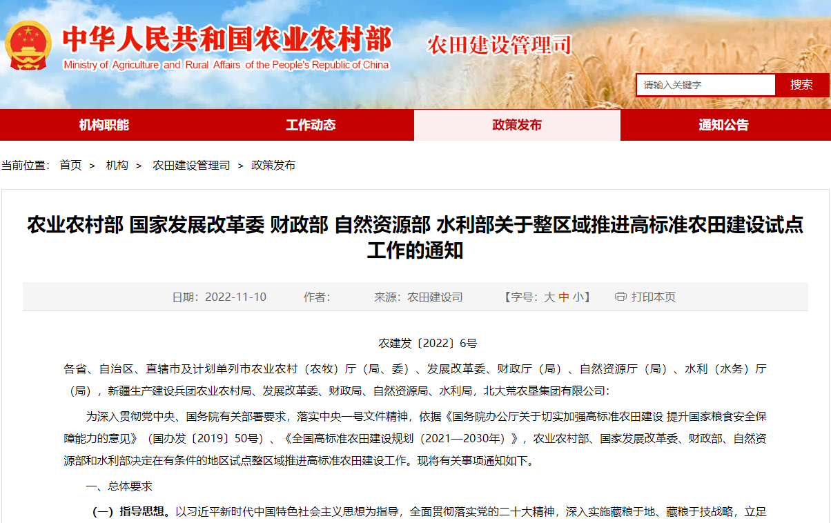 為深入貫徹黨中央、國務院有關部署要求,落實中央一號文件精神,依據《國務院辦公廳關于切實加強高標準農田建設 提升國家糧食安全保障能力的意見》(國辦發〔2019〕50號)、《全國高標準農田建設規劃(2021—2030年)》,農業農村部、國家發展改革委、財政部、自然資源部和水利部決定在有條件的地區試點整區域推進高標準農田建設工作?,F將有關事項通知如下。