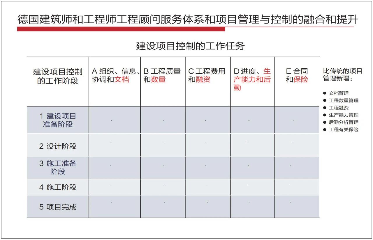另外,德國的建筑師和工程師服務體系中要求強化項目管理,對項目管理和設計進行融合。在項目控制方面,包括了5個階段,需要做5方面工作,就是25項任務。比如,在設計準備階段、建設項目準備階段,要做組織信息協調、工程質量的準備控制、投資控制、融資服務、提供進度服務、合同服務等,這就把顧問服務和項目管理服務很好地結合了起來。