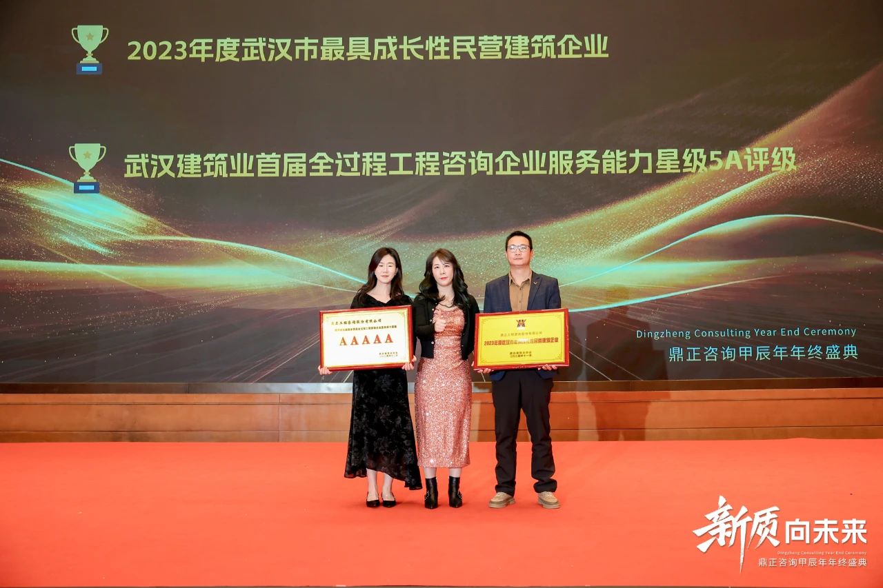 在過去的一年里,鼎正在專家輔助人、專項債、超長期特別國債、中央預算內資金、全過程工程咨詢等業務板塊中,展現出強勁的創新力,并獲得行業廣泛的認可。當晚,武漢建筑業協會領導代表、全咨分會秘書長陳金琳女士,為我們頒發了2023年度武漢市最具成長性民營建筑企業、武漢建筑業首屆全過程工程咨詢企業服務能力星級5A評級兩項榮譽。