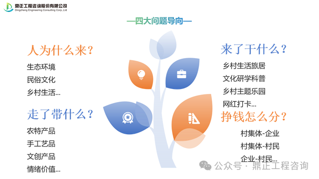 圍繞人為什么來、來了干什么、走了帶什么、掙錢怎么分四大問題去思考鄉(xiāng)村該怎么運(yùn)營,去明確鄉(xiāng)村的主題定位、發(fā)展方向、核心產(chǎn)品、運(yùn)營方式,更好地推進(jìn)鄉(xiāng)村運(yùn)營。