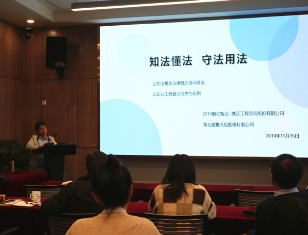 11月15日下午,我司組織開展了2019 年公司法概論與風險防控知識培訓。本次培訓邀請湖北諾善風險管理有限公司王振宇律師、馮美淵律師就《公司法》實務知識進行講解,公司董事長王雁然、副總經理毛迎霞、技術總監朱立冬、副總經理姚建功等領導及各部門中層管理人員、企業發展中心、行政中心全體成員參加了本次培訓,各分公司同事遠程同步參與學習。